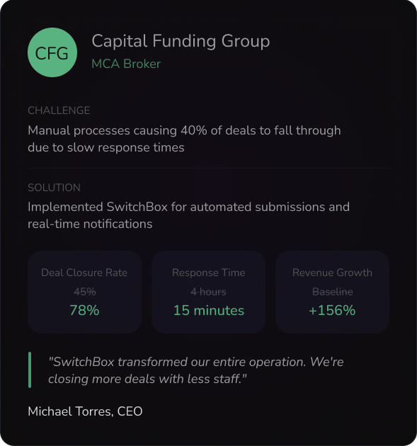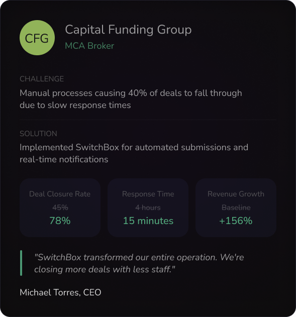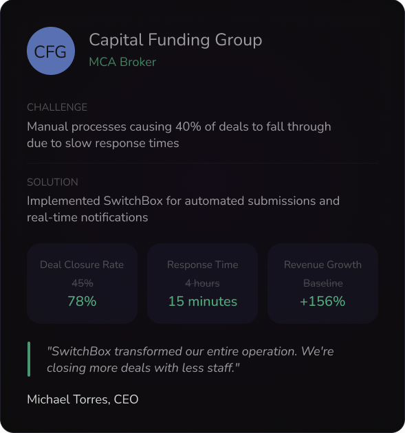 Our intelligent algorithm analyzes deal criteria and historical success rates to suggest the best lender matches, increasing your approval rates significantly.